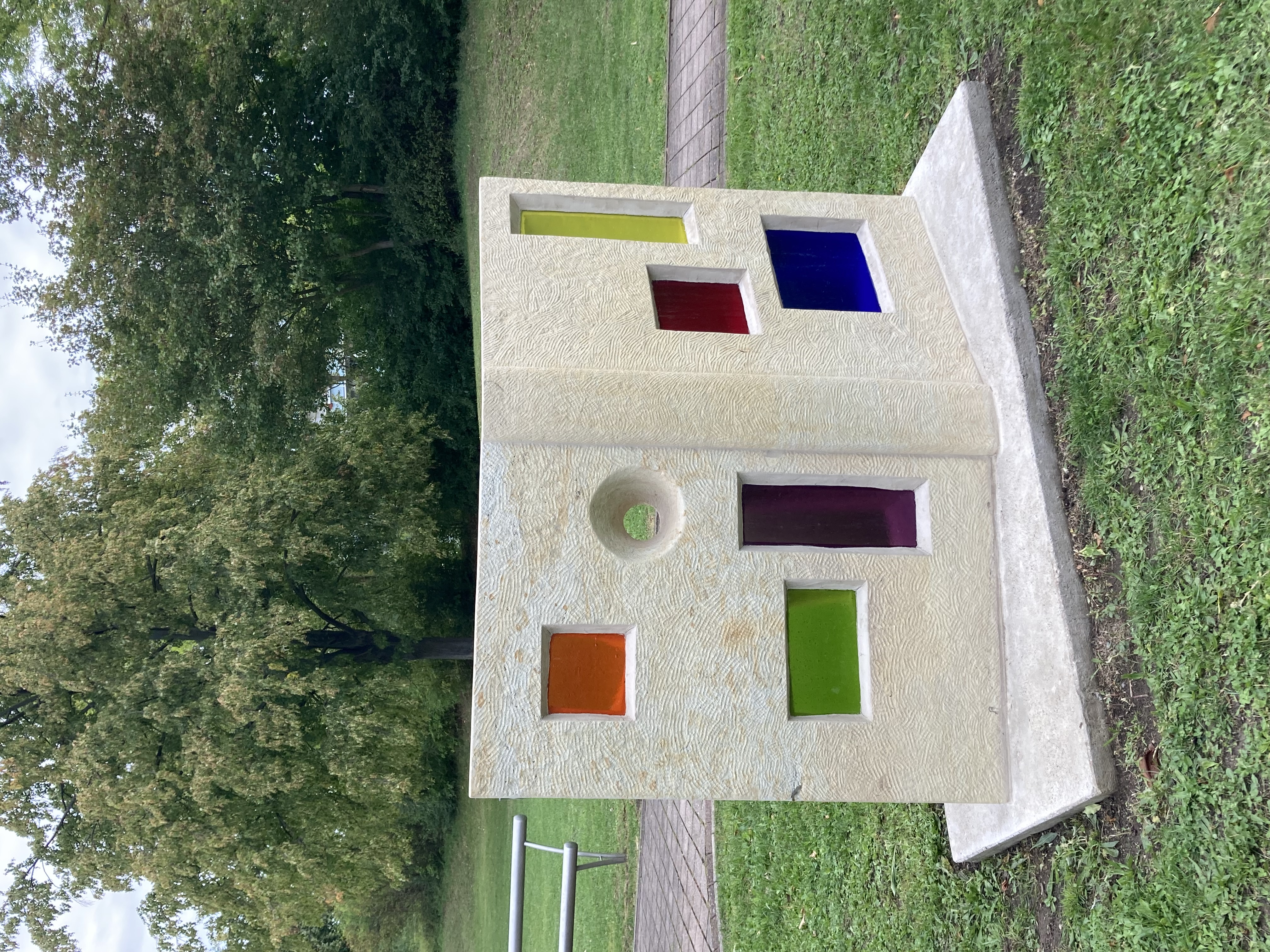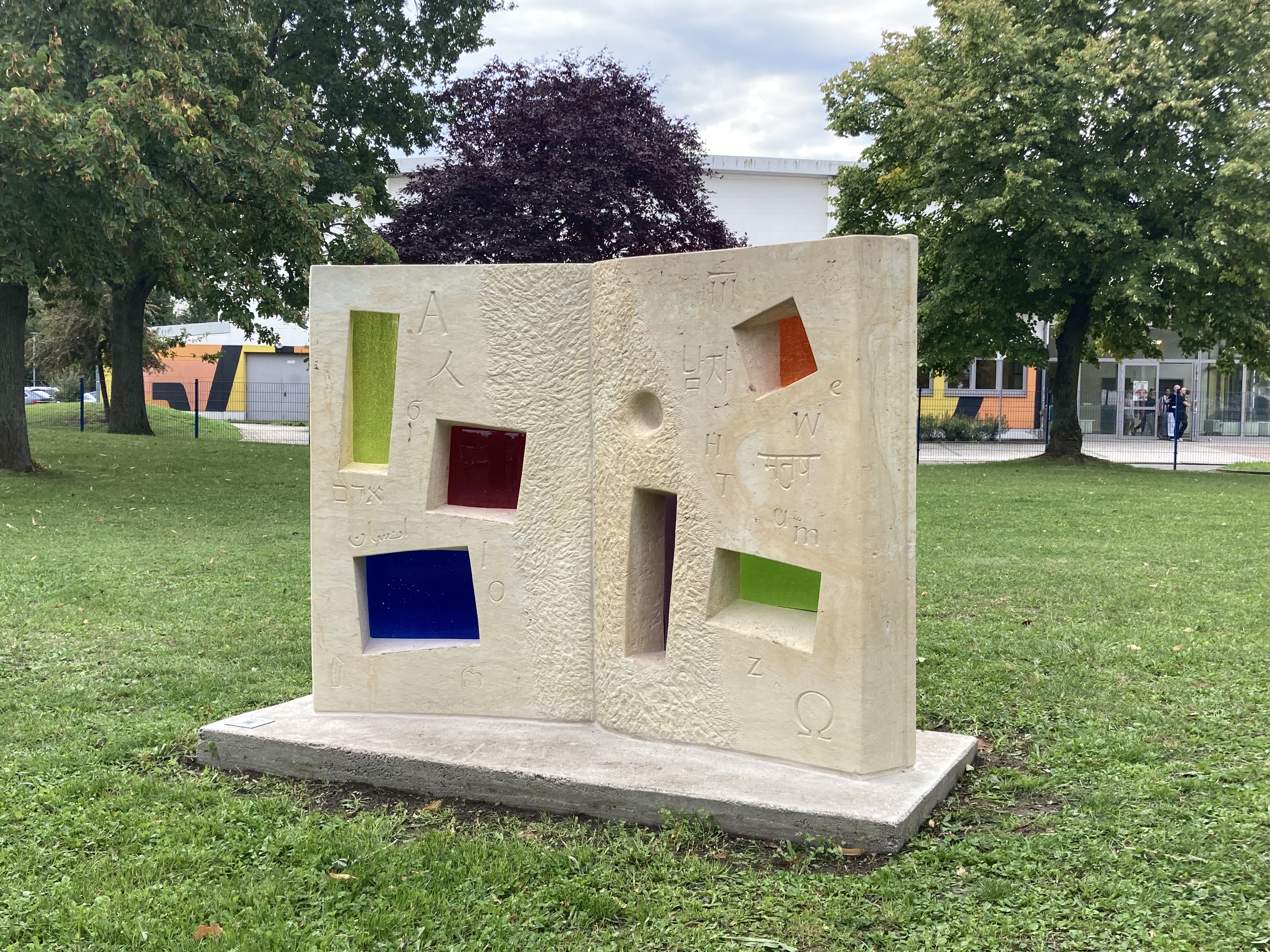 Die Skulptur stellt ein stehendes aufgeschlagenes Buch dar, mit Fenstern, durch die farbiges Licht fällt. Dies symbolisiert die geistigen, gedanklichen und emotionalen Räume, aus denen heraus das Erleben und Wissen kommt, das sich dann im Buch verdichtet niederschlägt. Dafür wird das Erlebte und Erkannte in Schrift wie in eine Art Codierung übertragen, die dann vom Lesenden wieder entschlüsselt wird und in ihm zu neuem Leben erwacht.