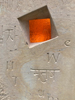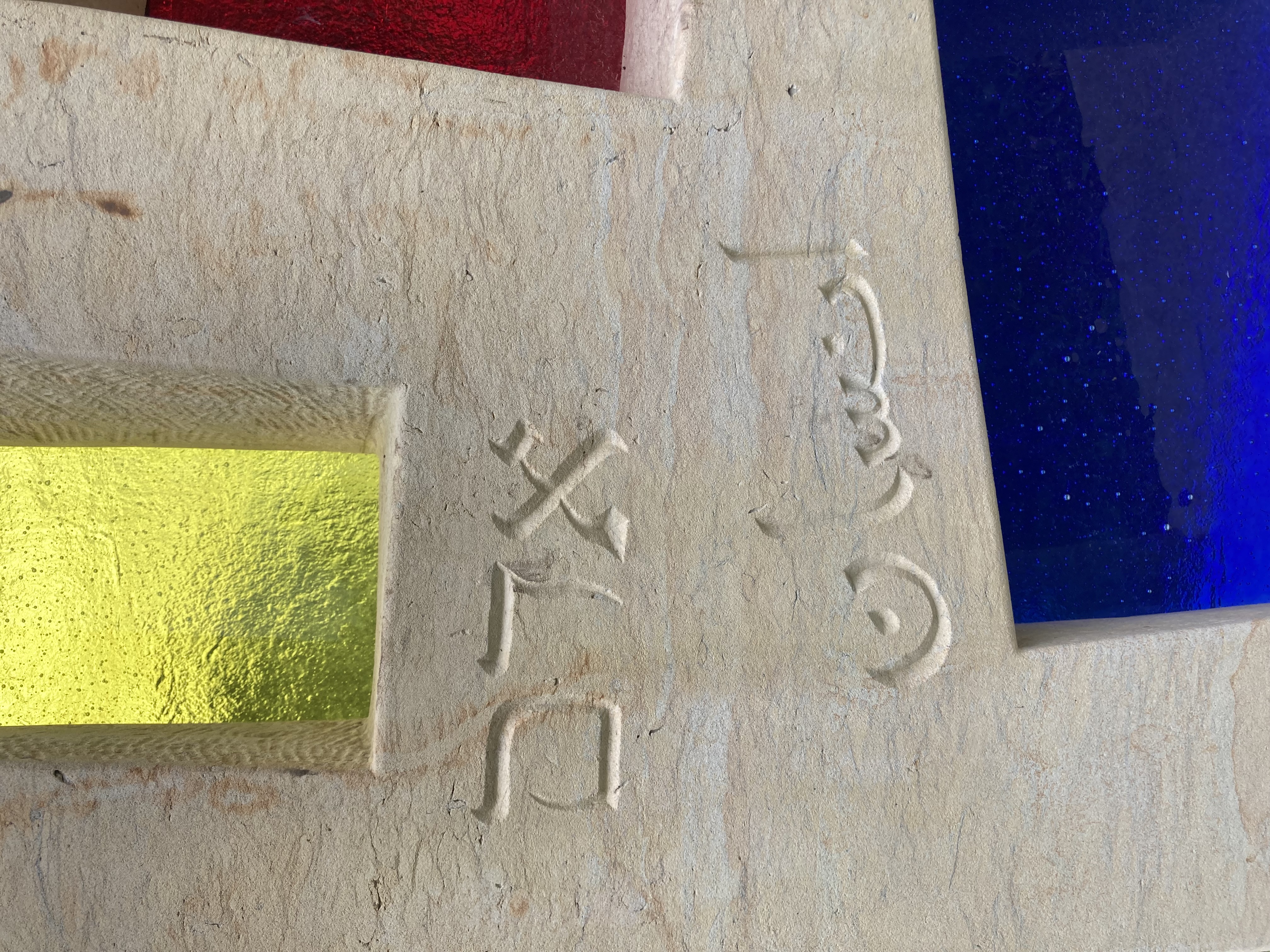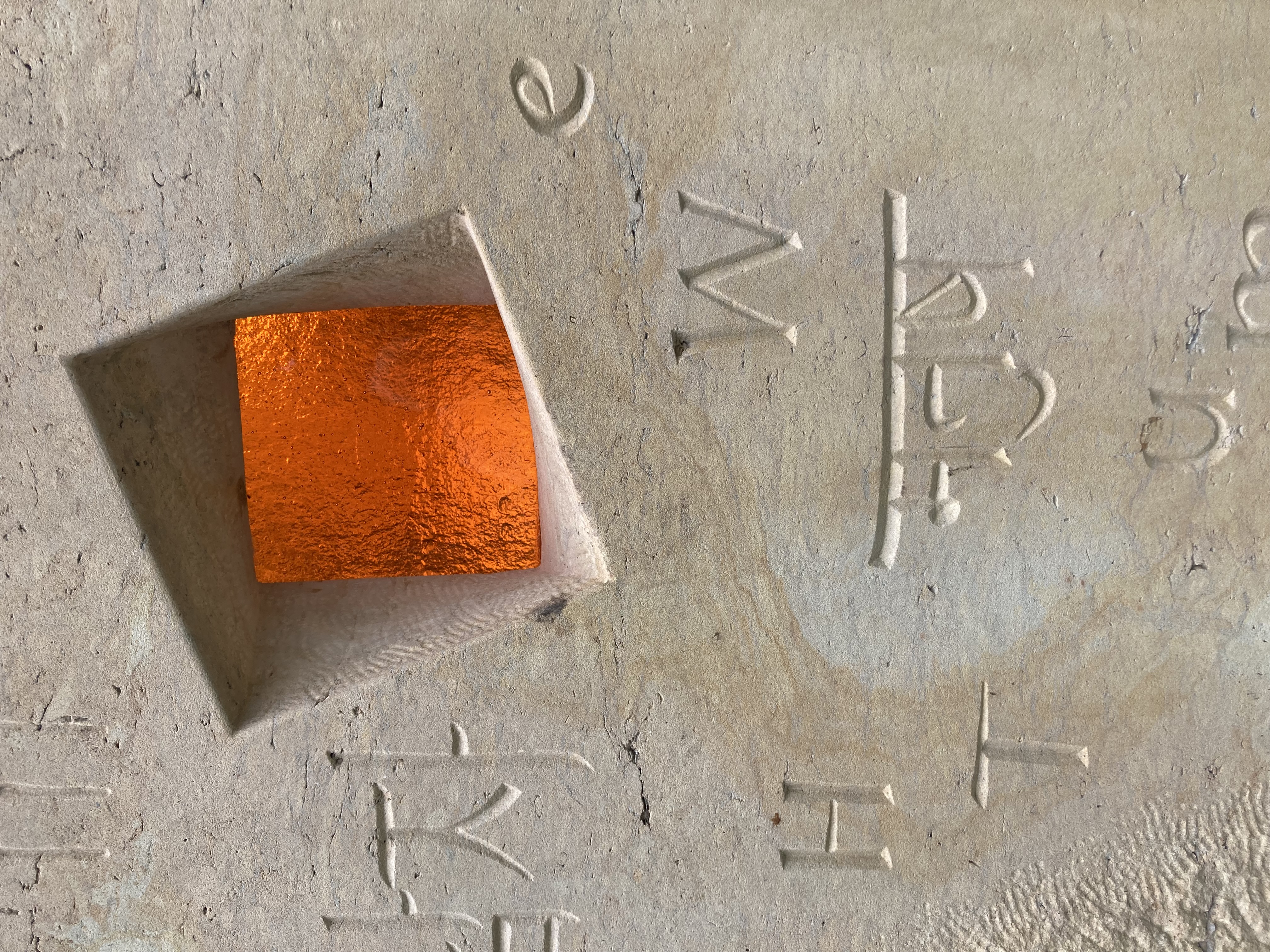 Die Schrift erscheint auf der Innenfläche der Skulptur in Form von einzelnen Zeichen aus verschiedensten Sprachen und Kulturen und verdichtet sich in einigen Sprachen zum Wort für "Mensch".